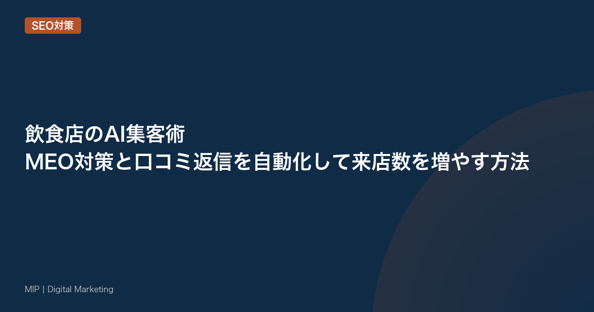 飲食店のMEO対策と口コミ管理は、AIを活用することで大幅に効率化できます。特に口コミ返信の自動化とGoogleビジネスプロフィール投稿の定期生成は、すぐに取り組める施策です。